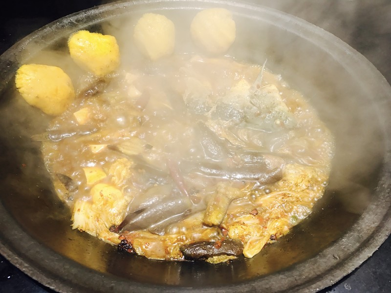 这天晚上我跟朋友去吃了传说中的鱼锅,是吉林特色菜。在炕上架一个大铁锅,烧柴炖鱼和配菜,味道不错,主要是暖和。
