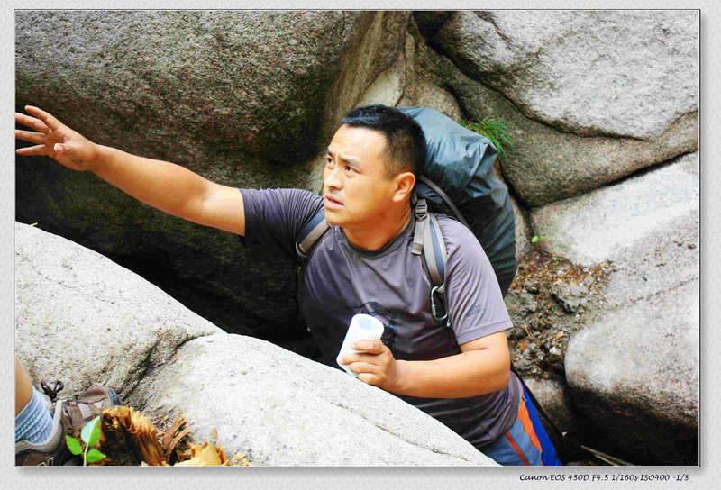 要想从这过,必须徒手攀过旁边的崖壁。抱着轻松心态来休闲游的大家没有心理准备,幸好有【熊出没】领队们保驾护航,充当挑山工