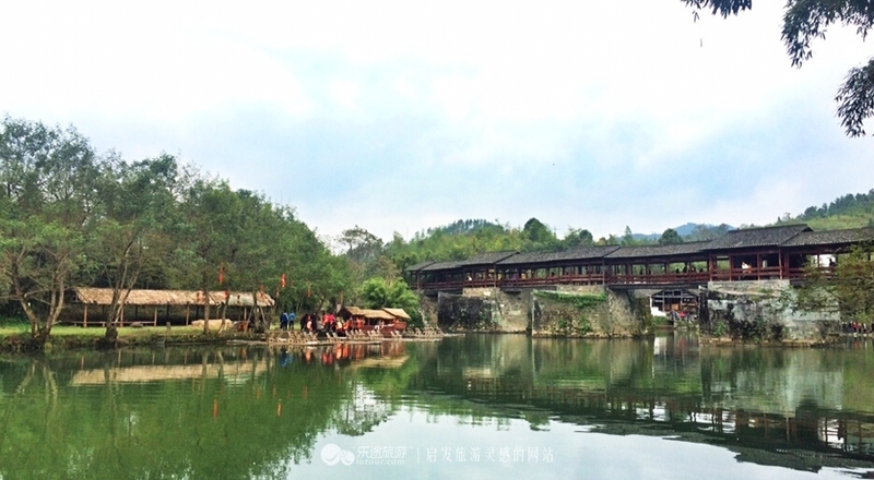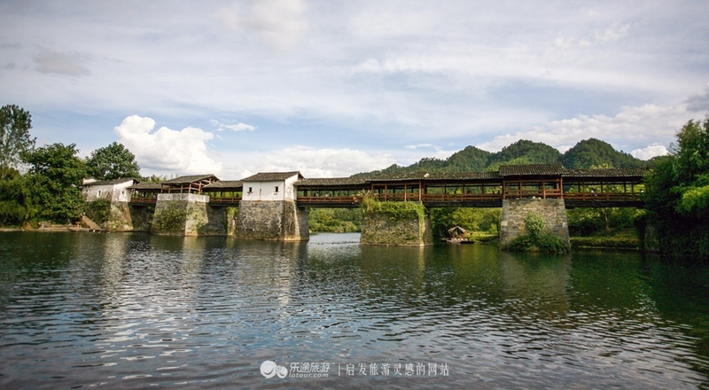 彩虹桥的名字很美,取自于“两水夹明镜,双桥落彩虹”的诗句,尤其是雨后天空上彩虹倒影在水中和廊桥相互辉映,非常漂亮,廊亭中石桌石凳。青山如黛,碧水澄清,清竹淡墨。