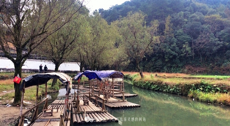 月亮湾夹在田野两岸,形如一弯月,碧绿的溪水,小舟上的船夫,往来于一泓碧水之间,青箬笠、绿簑衣、斜风薄雾不须归,一派烟雨朦胧,如梦似幻。
