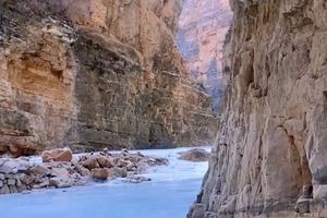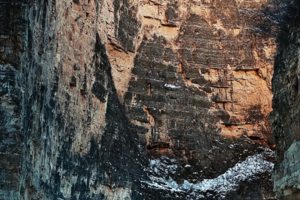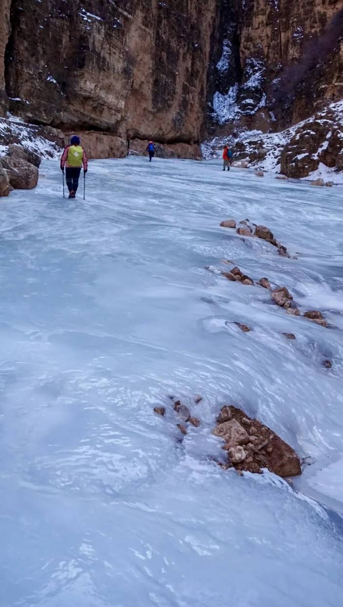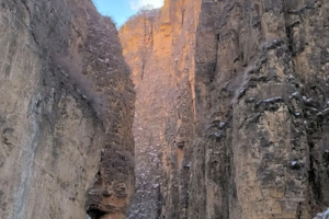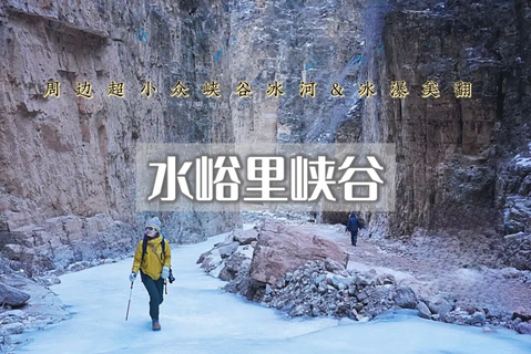 距谷口约3.5公里处有一高高的立石出现在路中,形似网红打卡地“飞狐峪一炷香”,就叫它“水峪里一炷香”吧。来到近前听到有流水声,俯身细听,感觉来自脚下的冰里。想起自己上学时给一位暗恋的女孩儿写了一首诗,里面有这样两句:“爱是冬雪下的冰河,情是闭上门的炉火”。雪下是冰,冰下有河,平静的外表下,你能看到我心如潮涌吗?