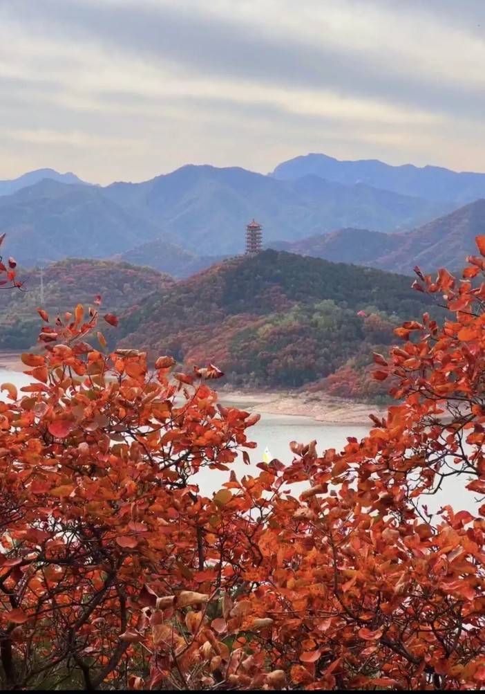 漫山红叶衬着金海湖的碧波,十分养眼。黄栌是金海湖北山步道的一大看点,春天嫩黄,夏天粉红,秋天则变身绚烂的红叶。金海湖步道没那么规整,也没那么气派。好在金海湖的景色很美,足以弥补这小小的缺陷。