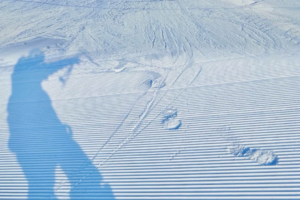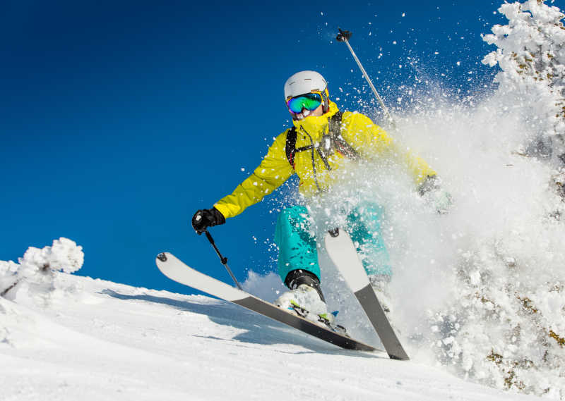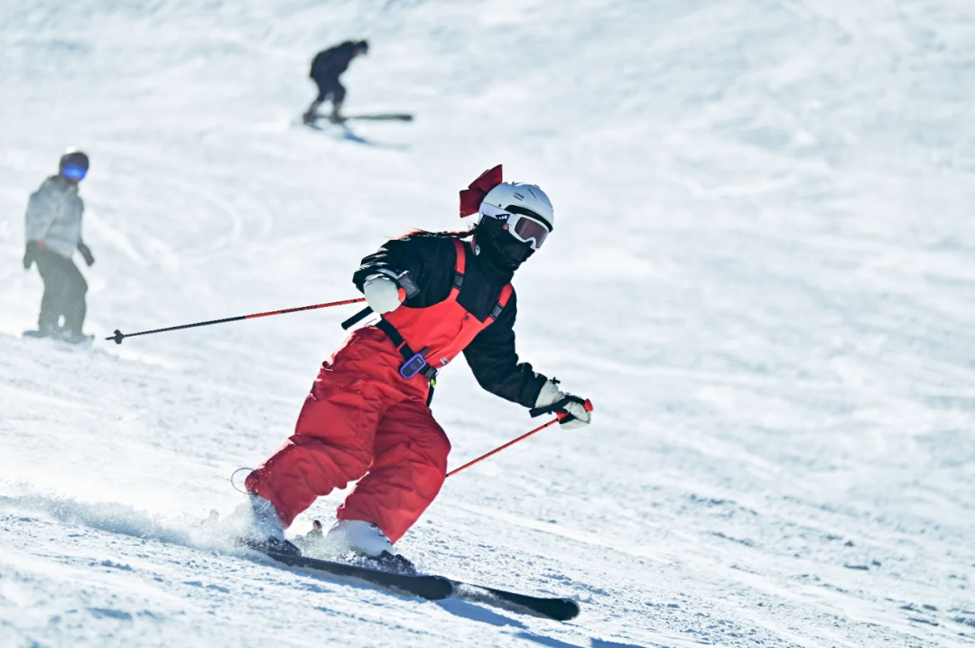 4.刹车:滑雪板呈八字形,膝盖内扣,身体重心放在两脚之间靠前的位置,用滑雪板的内刃卡住雪面。