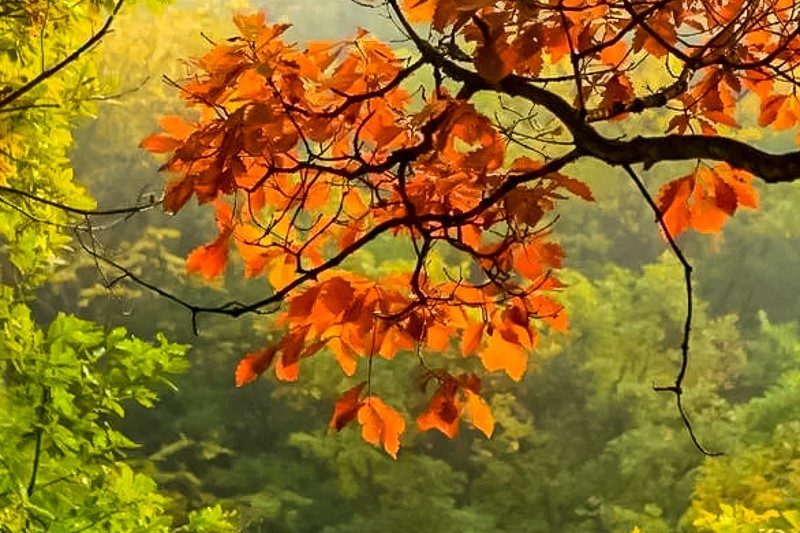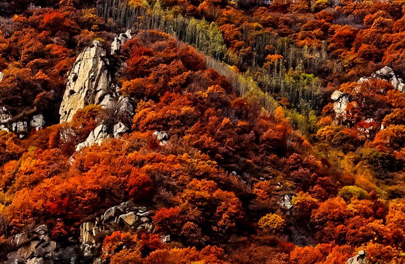 五角枫叶在秋阳中红得纯粹热烈,白桦林中红绿相间,