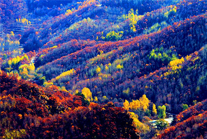 这里山峦起伏,林海茫茫,有森林上千公里,处于针叶林和阔叶林和阔叶林的过渡地带,有油松、山杨、蒙椴、辽东栎、白桦、山杏、荆条等。春季山花烂漫,夏季林海滔滔,秋季色彩缤纷,冬季银装素裹。