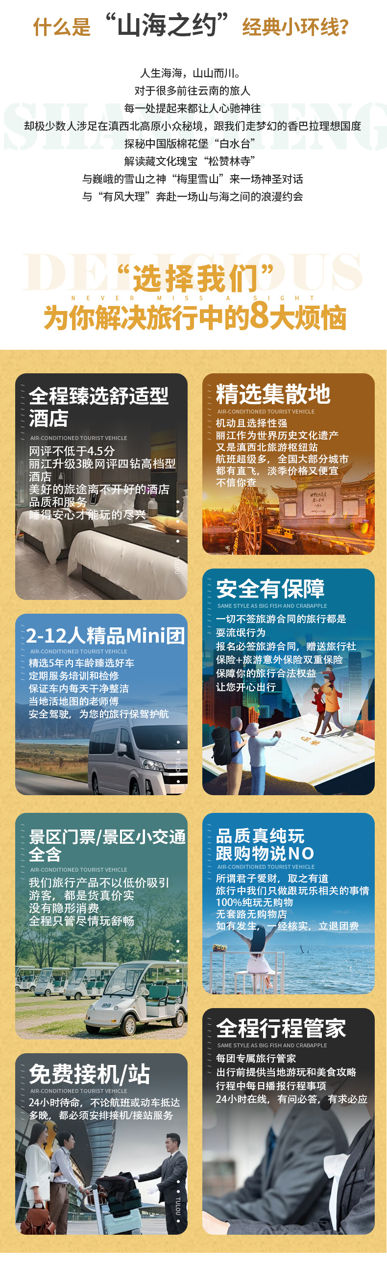 ▷交通:不包含各地到达丽江集散的往返大交通费用(如:机票和高铁火车票等,提前预定通常折扣都会很低);