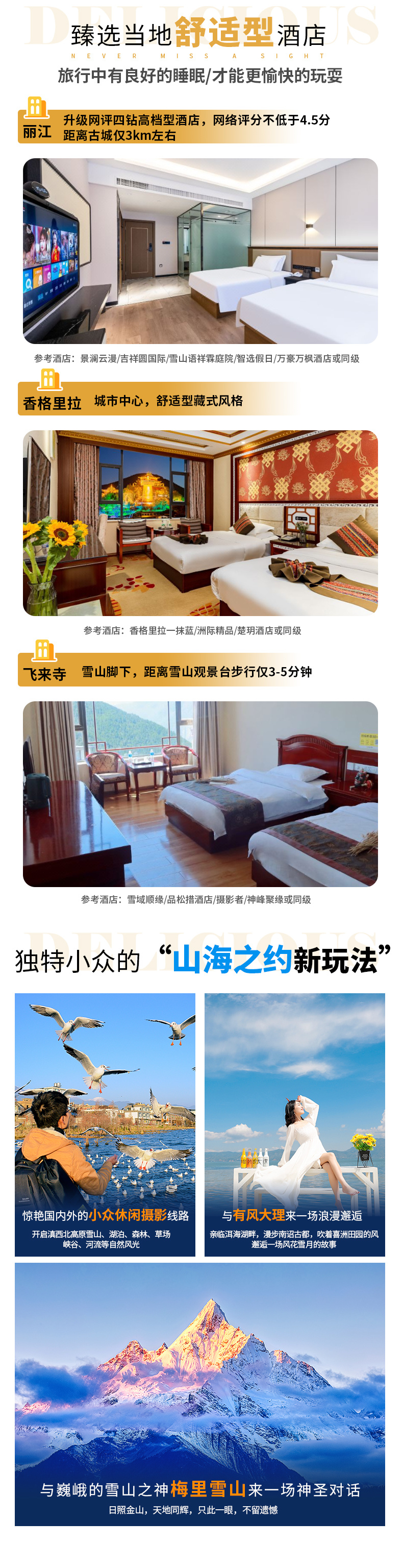 2、住宿:全程5晚优选当地酒店(丽江3晚四钻高档型酒店,德钦1晚舒适型酒店,香格里拉1晚舒适型酒店);