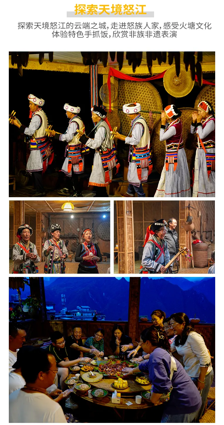 晚餐推荐怒族手抓饭,走进怒族人家,感受火塘文化,体验特色手抓饭,欣赏非族非遗表演。