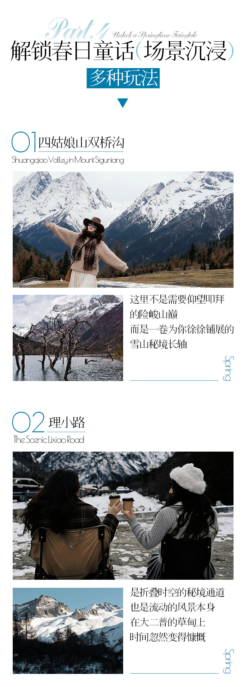 12:00-16:00:游览双桥沟(建议游玩4小时),这是四姑娘山景区中最适合春季游玩的地方。可乘观光车至沟尾红杉林,然后依次向下游览,重点推荐四姑娜措(湖泊雪山倒影)和撵鱼坝(春季可体验雪山漂流)。