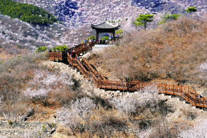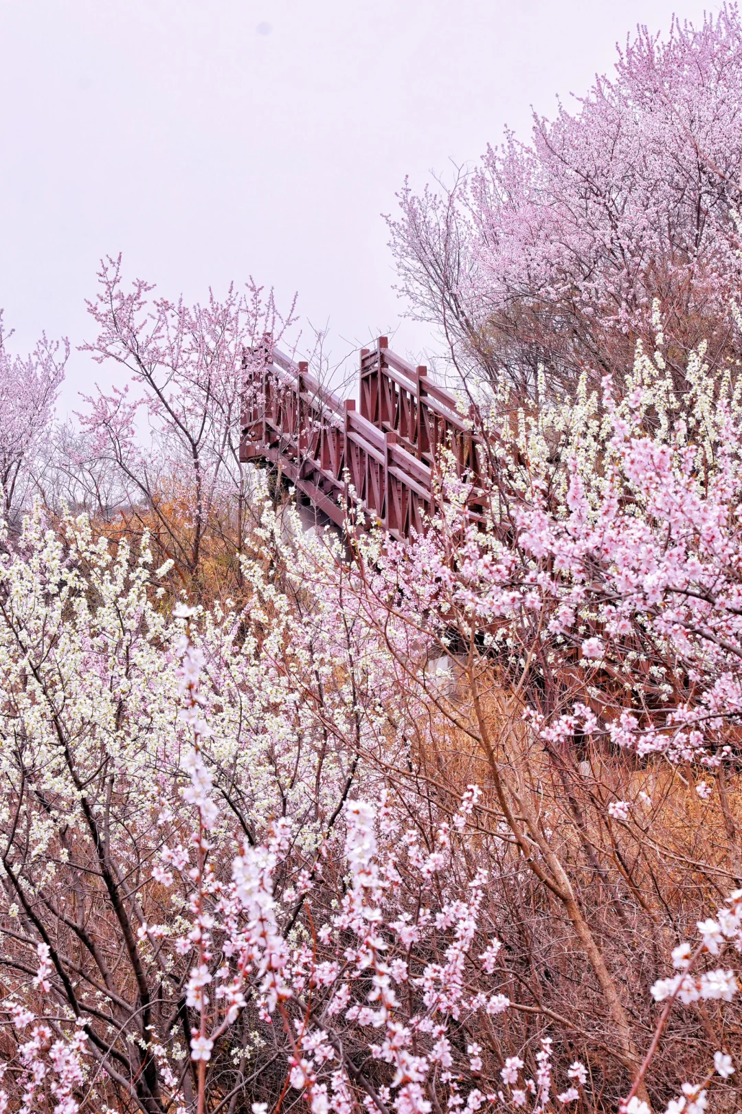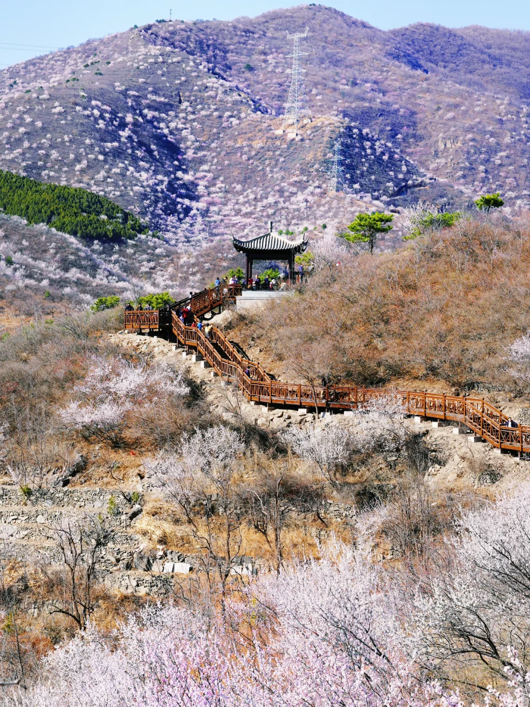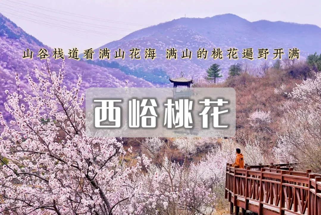 -彼时的西峪村远山近山桃花开形成绵延数公里的桃花花海如霞似锦,如海如潮漫步桃林,仿佛置身于“世外桃源” 更妙的是西峪村有一条木栈道延伸在桃花海中为游人徒步赏花、拍照赏景提供了绝佳方便西峪村木栈道,中途设有休息凉亭徒步新手友好。