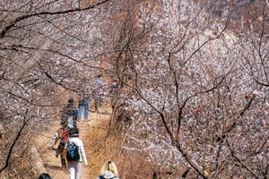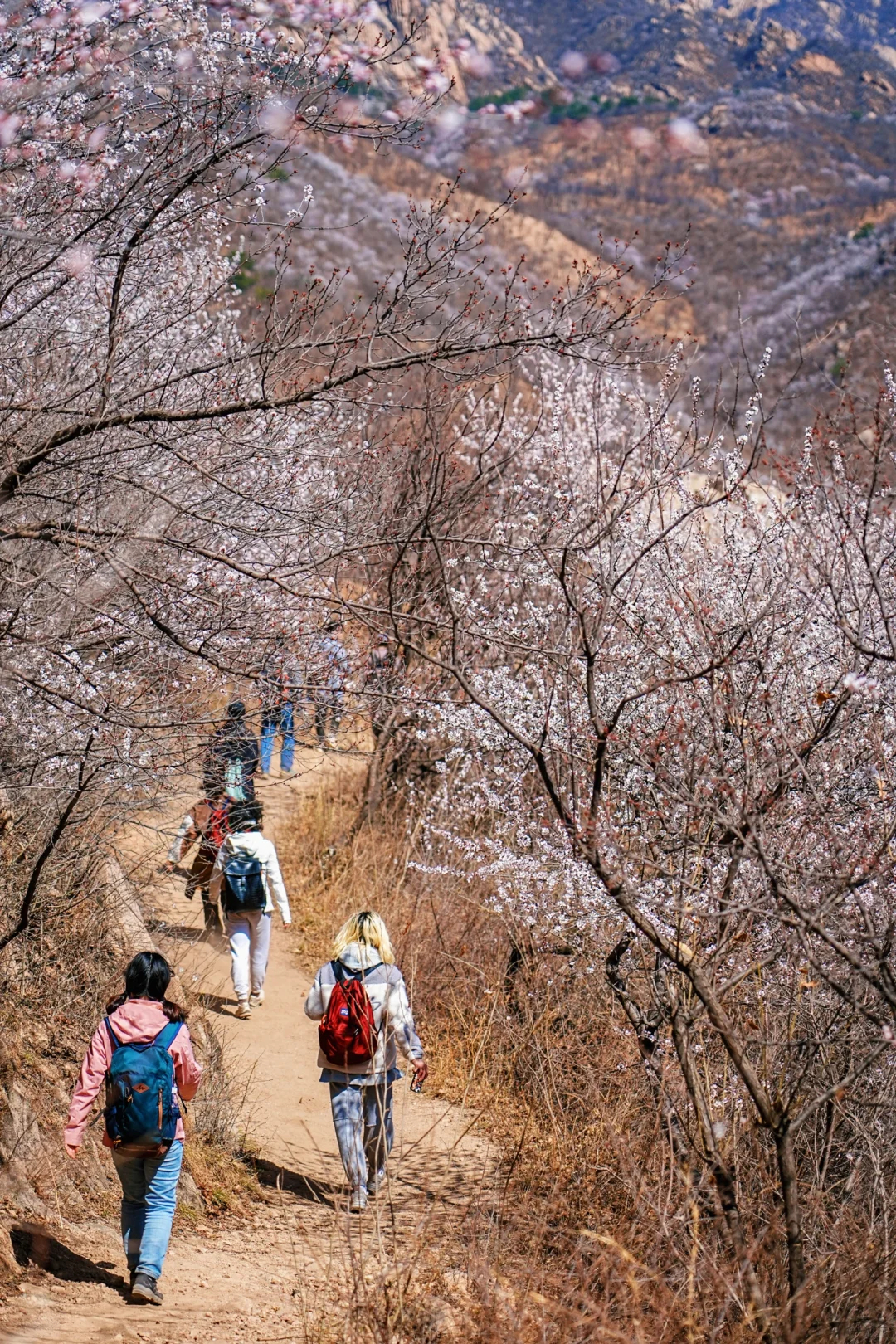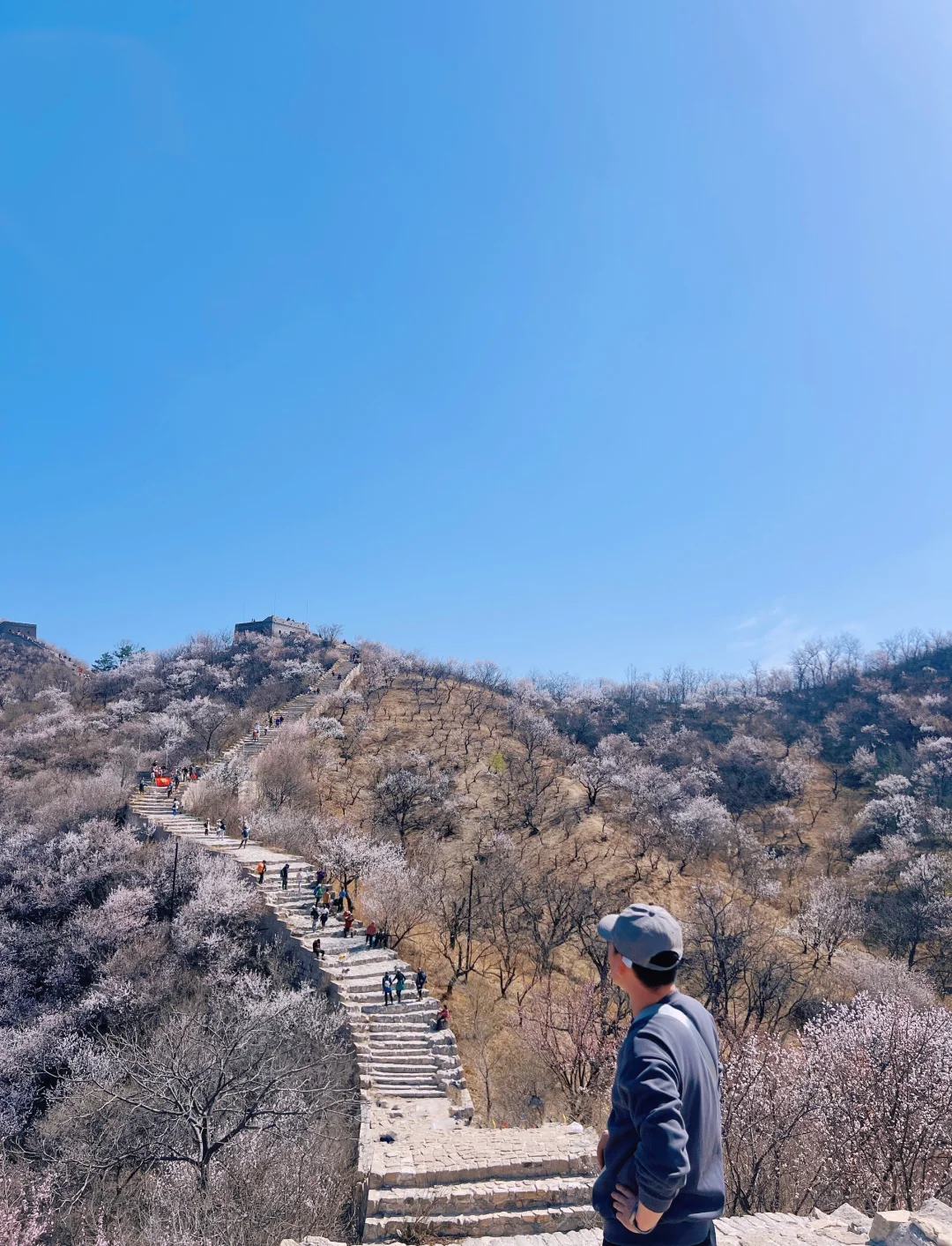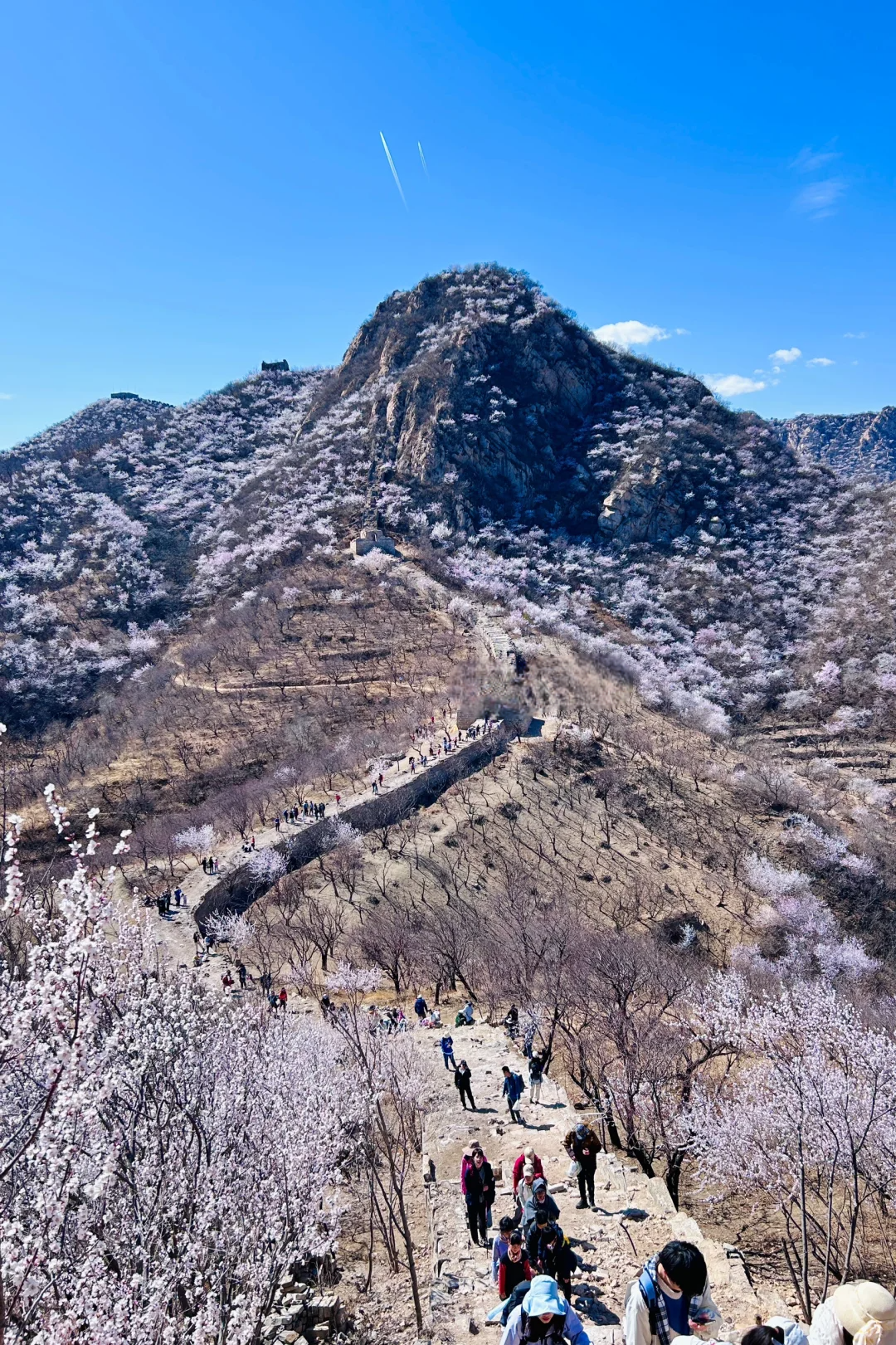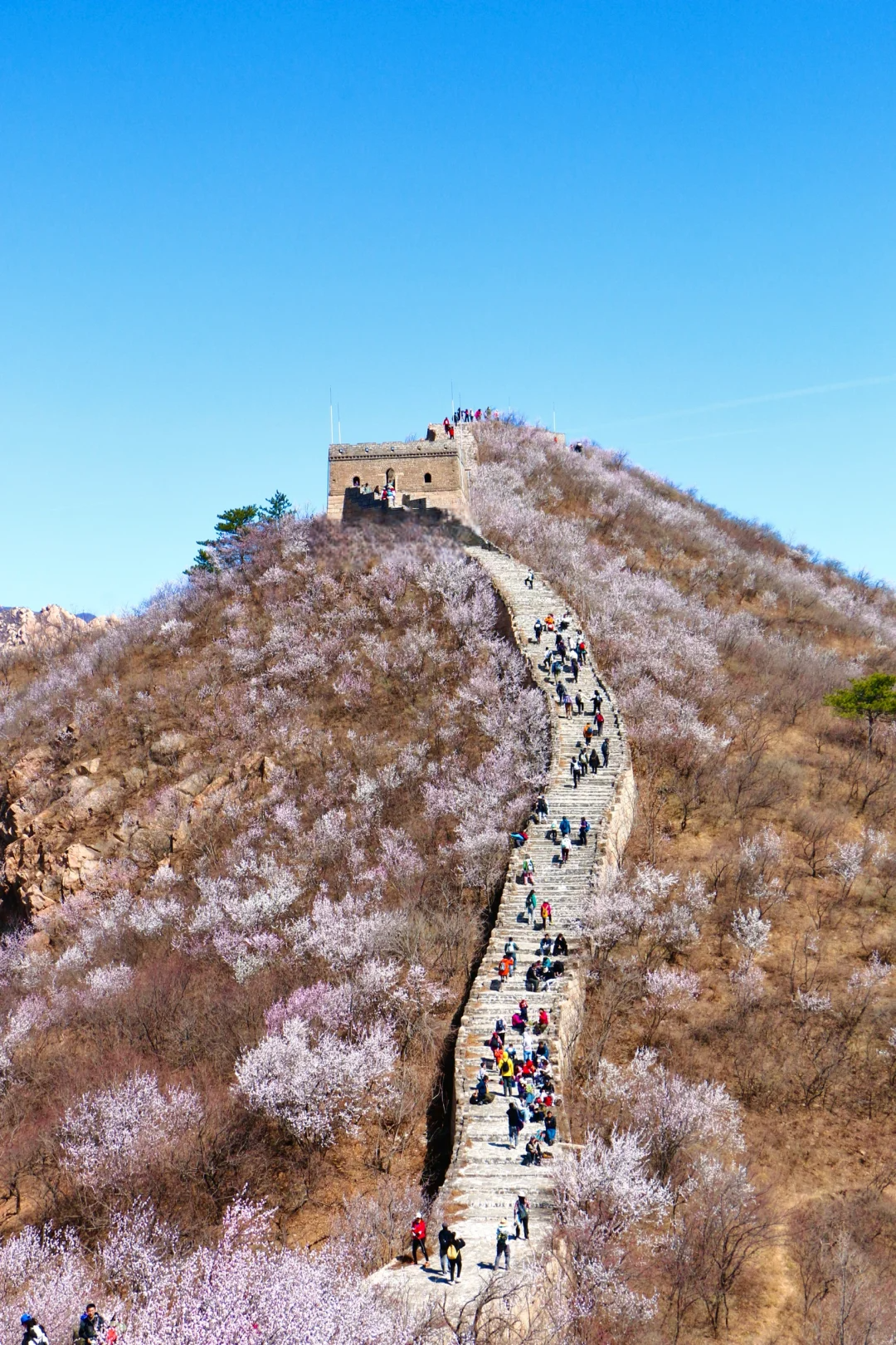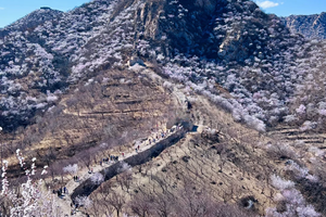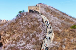 - 龙泉峪野长城绵延于崇山峻岭之上,一直延伸到远方,两侧大山上开满山桃花和杏花。满山遍野的山桃花摇曳生姿,就像上帝之手撒了一把花种子,在春风里发芽绽放。而古长城在山花和蓝天印衬下,不再显得那么苍凉悲壮,更加的神采奕奕,魅力四射。