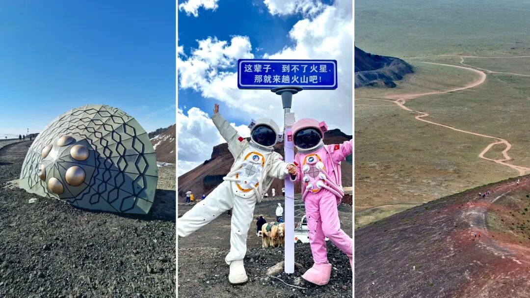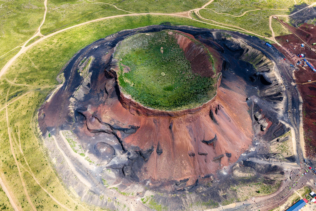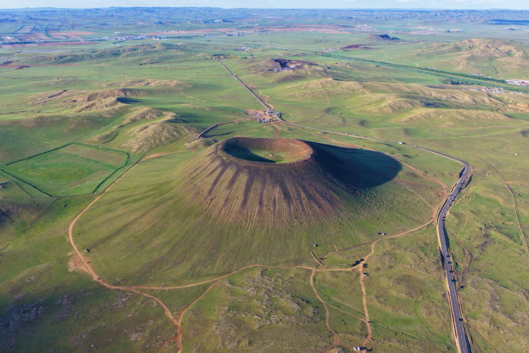 乌兰哈达火山北起大兴安岭北段东坡的诺敏河火山群,经大兴安岭的阿尔山—柴河火山群、锡林浩特—阿巴嘎火山群,南抵察哈尔右翼后旗的乌兰哈达火山群,绵延近千公里,其中乌兰哈达火山群直到2012年才被国内外火山学界所知。踏入草原临近乌兰哈达火山,红褐色山体拔地而起,雄浑壮阔,与周边白雪柔美形成刚柔并济的震撼景致。