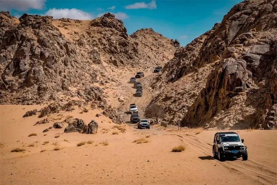【哈隆格乃大峡谷】峡谷内高山林立,地貌奇特。先后穿越河谷、沙山、戈壁,感受多地形带来的驾乘乐趣。这里是唯一一次沙漠与山脉相连的地方。峡谷两侧怪石林立,谷底是松软的沙地,对越野车的动力及驾驶技术都是极大的考验,这里也是行摄爱好者的天堂。11:00车队挑战终极大沙山,感受大自然的鬼斧神工。站在沙山之巅,尽情享受【蒙版黑独山】的壮丽景色,这里更是旅拍的绝佳地点。