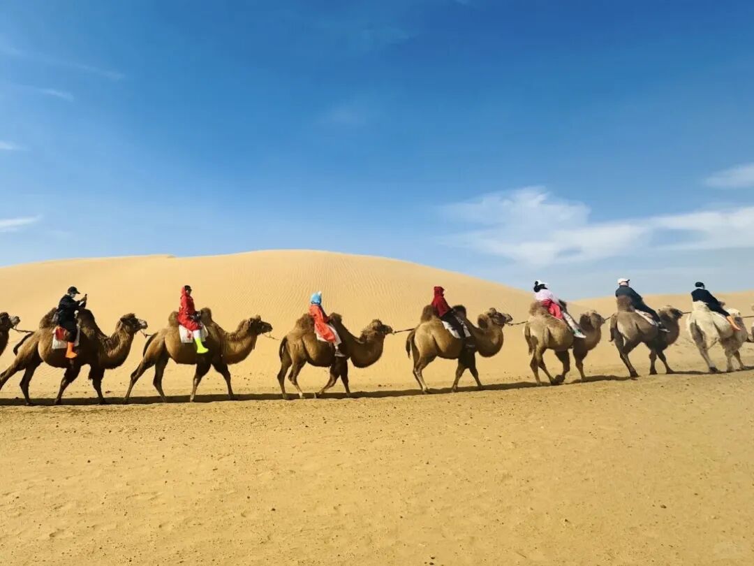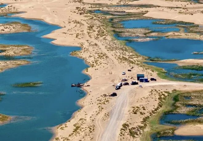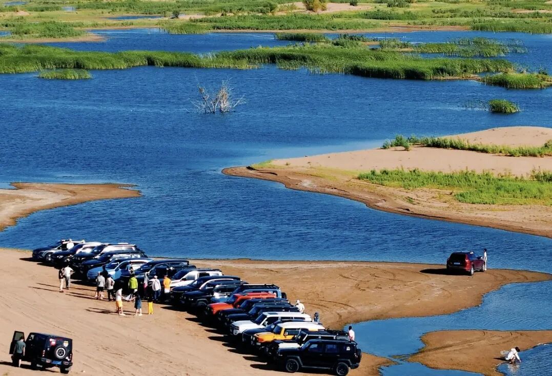 - 早餐后乘坐越野车前往【库布齐沙漠千岛湖】体验沙漠和湖水拥抱的千岛湖半日穿越。库布齐沙漠位于内蒙古鄂尔多斯高原北部,西、北、东三面,均以黄河为界,风狂沙漫,植被稀疏,放眼望去,大漠浩瀚,长河如带,沙海茫茫,月弯似钩,气魄宏大,如诗如画。【库布齐沙漠千岛湖】黄河水流入沙漠,携带的泥沙逐渐沉淀,使得河水变得清澈见底,在沙漠中形成了众多湖泊和岛屿,宛如一颗颗蓝色宝石,构成了 “沙漠千岛” 的奇观。湛蓝的湖水与金色的沙漠相互映衬,形成了鲜明而又和谐的色彩对比。湖水在阳光的照耀下波光粼粼,沙漠在微风的吹拂下泛起层层沙浪,景色壮美而又独特。