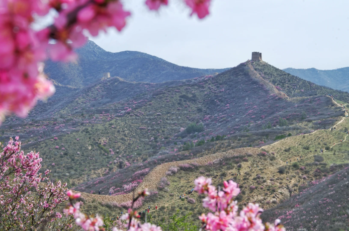 青边口位于张家口东望山乡,是中原与塞北间的重要连接点。青边口漫山遍野的榆叶梅,如云蒸霞蔚,红遍边关古城,是最佳赏梅地点,每年4月底到5月初,梅花开放。山腰已盛开,山顶还是花苞,本周赏花点上移,花漫山遍野,超美。欢迎一起来踏青赏花。可以尽情地拍照和赏景。榆叶梅,是蔷薇科李属灌木稀小乔木植物。榆叶梅枝条开展,具多数短小枝;叶片宽椭圆形至倒卵形,先端短渐尖,叶边具粗锯齿或重锯齿;花果期4-5月;花先于叶开放;雄蕊短于花瓣,花柱稍长于雄蕊;果实近球形,红色,果肉薄。因其叶片像榆树叶,花朵酷似梅花而得名榆叶梅。